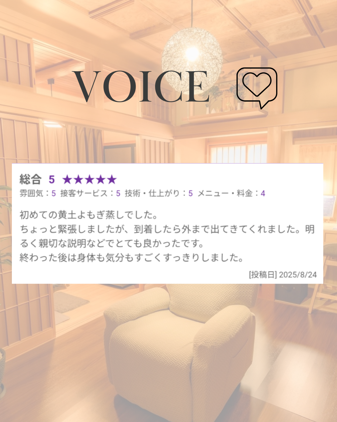 口コミは、初回来店されたときのもので、また、よもぎ蒸しがやりたくなったと2週間後ご来店してくださいました。
